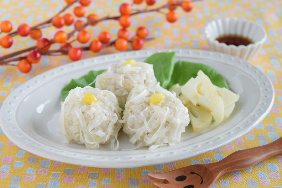 シューマイの皮を細切りにして、まわりに付けるだけのため、お子さんも楽しくできると思います。最後のコーンをのせるところまでお願いしちゃいましょう。