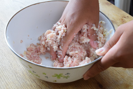 シューマイの具を「こねる」「丸める」、具に「皮を付ける」工程を手伝ってもらえます。