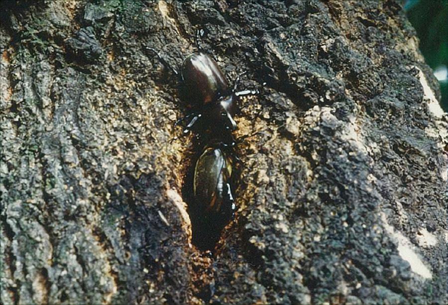 カブトムシは、6~8月の夜、ドングリが実る老木の幹にある傷口から出る樹液に集まります。発酵した樹液はお酒のような匂いを出し、カブトムシだけでなく多くのクワガタムシ類、ハナムグリ類、そして恐ろしいスズメバチたちも集まってきて、大にぎわいになります。通称「昆虫酒場」と呼ばれ、昆虫少年、少女たちの秘密の場所となります。