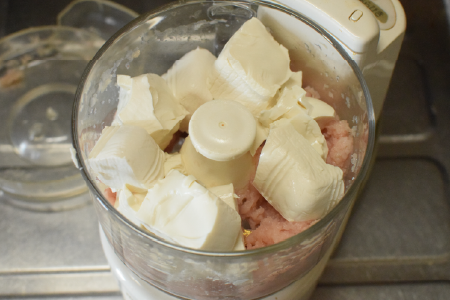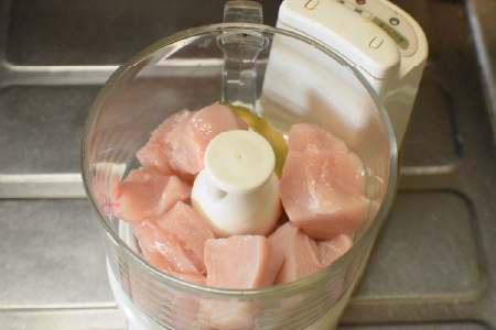 - ❶鶏肉は一口大に切る。フードプロセッサーに鶏肉を入れ、粗く攪拌する。ここに豆腐を適当な大きさにちぎって入れ、滑らかになるまで攪拌する。