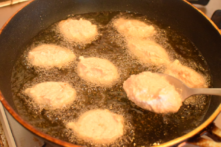 - ❸フライパンに多めの油を入れて180度に熱し、❷をスプーンで一口大にすくって油に落とす。両面3分ほど揚げ焼きにする。