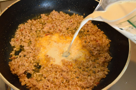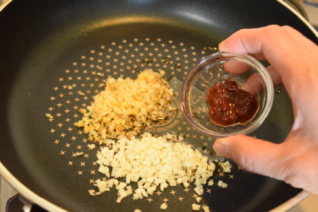 - ❷フライパンにごま油・にんにく・しょうが・豆板醬を入れて熱し、ひき肉を入れて炒める。