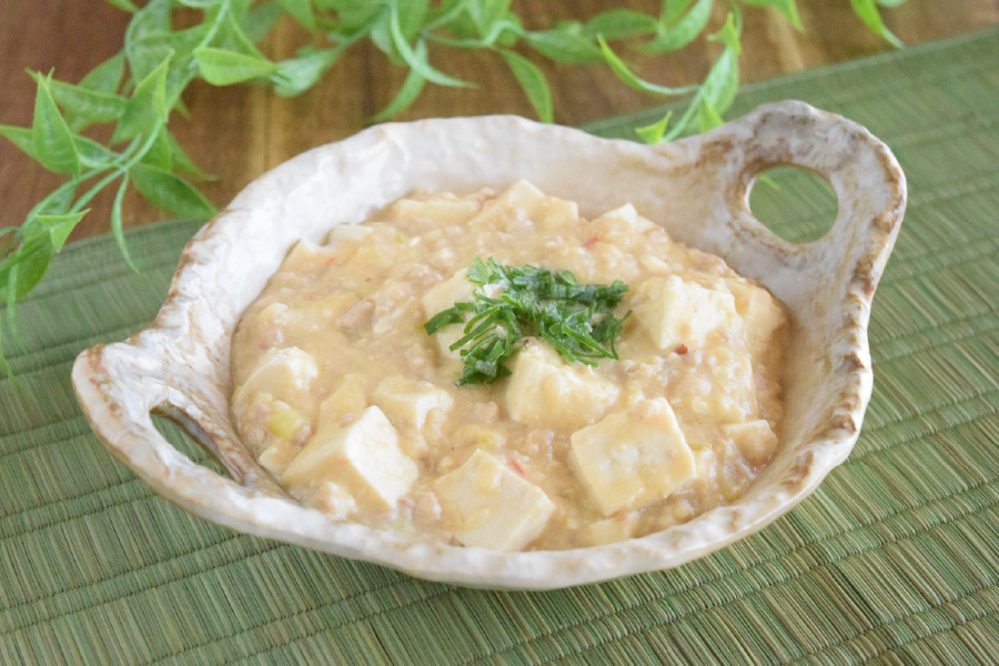 麻婆豆腐といえば辛みの効いた茶色いイメージがありますが、今回は辛さも味もマイルドな豆乳ベースの麻婆豆腐です。豆乳・豆腐・みそ…といろいろな大豆製品を使って作りました。